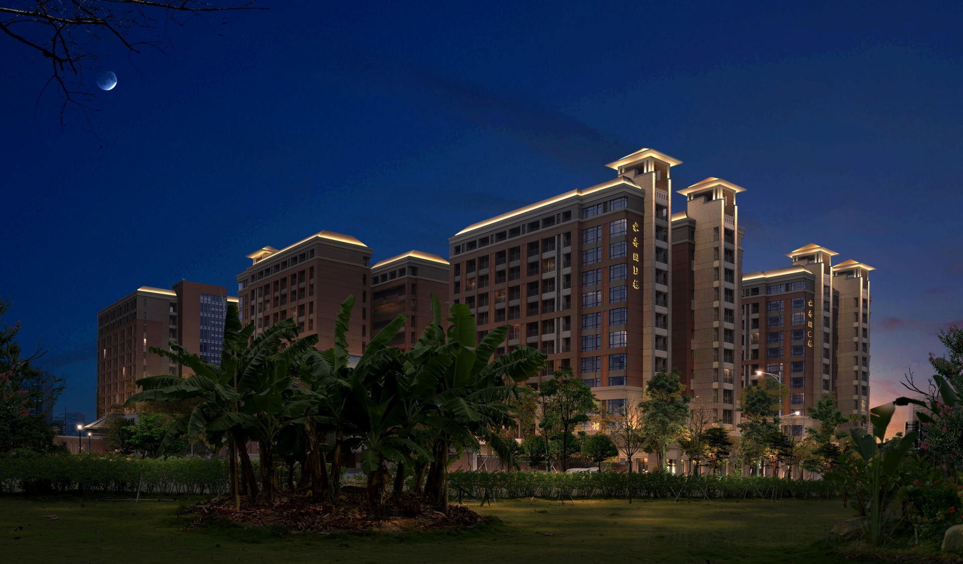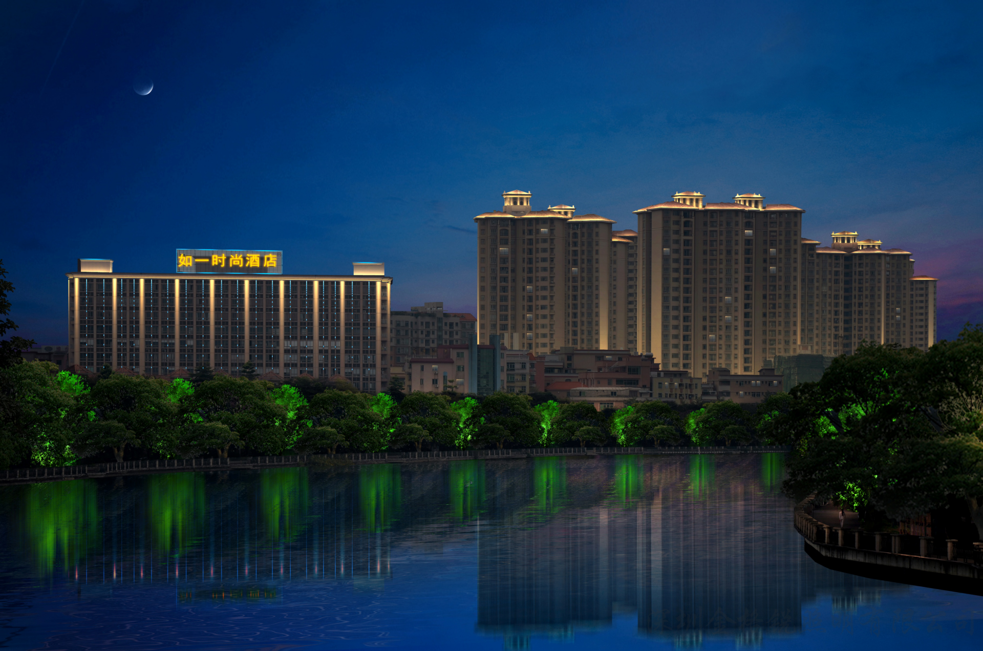 | 夜景簡介 | 麻涌華陽湖拈花寺周邊建筑主要體現(xiàn)城市天際線,統(tǒng)一立面形象,展示城市夜間魅力。 |