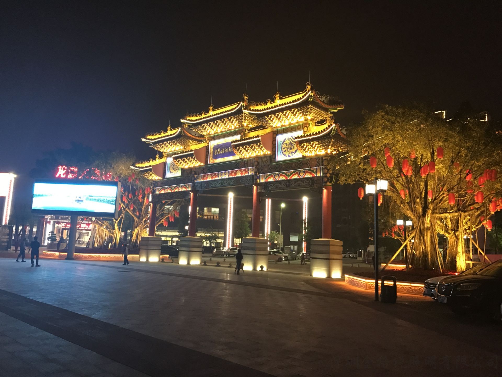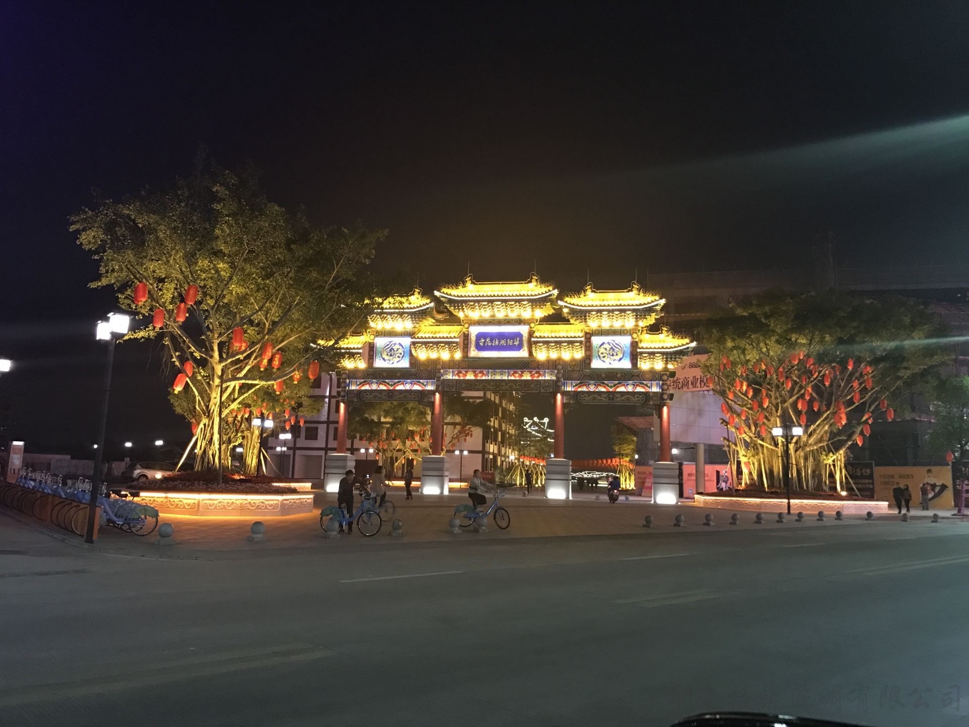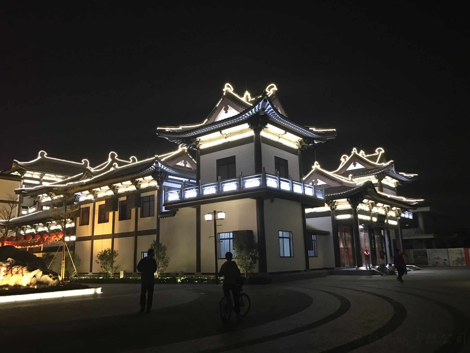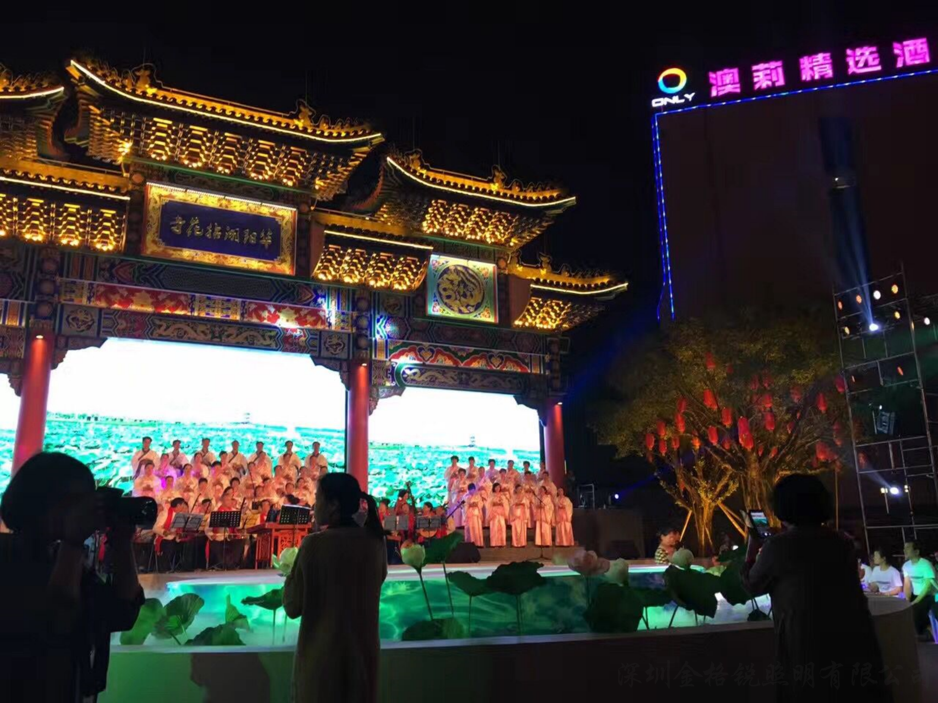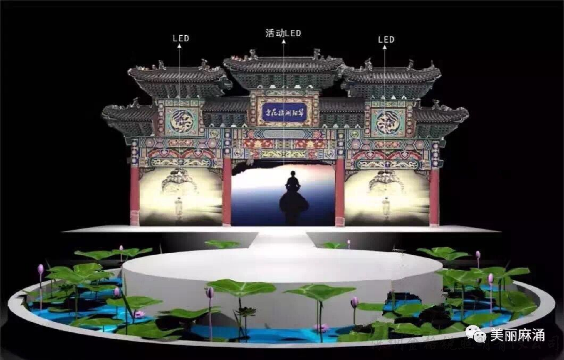 | 夜景簡介 | 麻涌華陽湖拈花寺牌坊配合節(jié)假日 舞臺演繹效果,融合了舞臺背景、 舞臺燈光演職人員的立體實(shí)景效果。 |