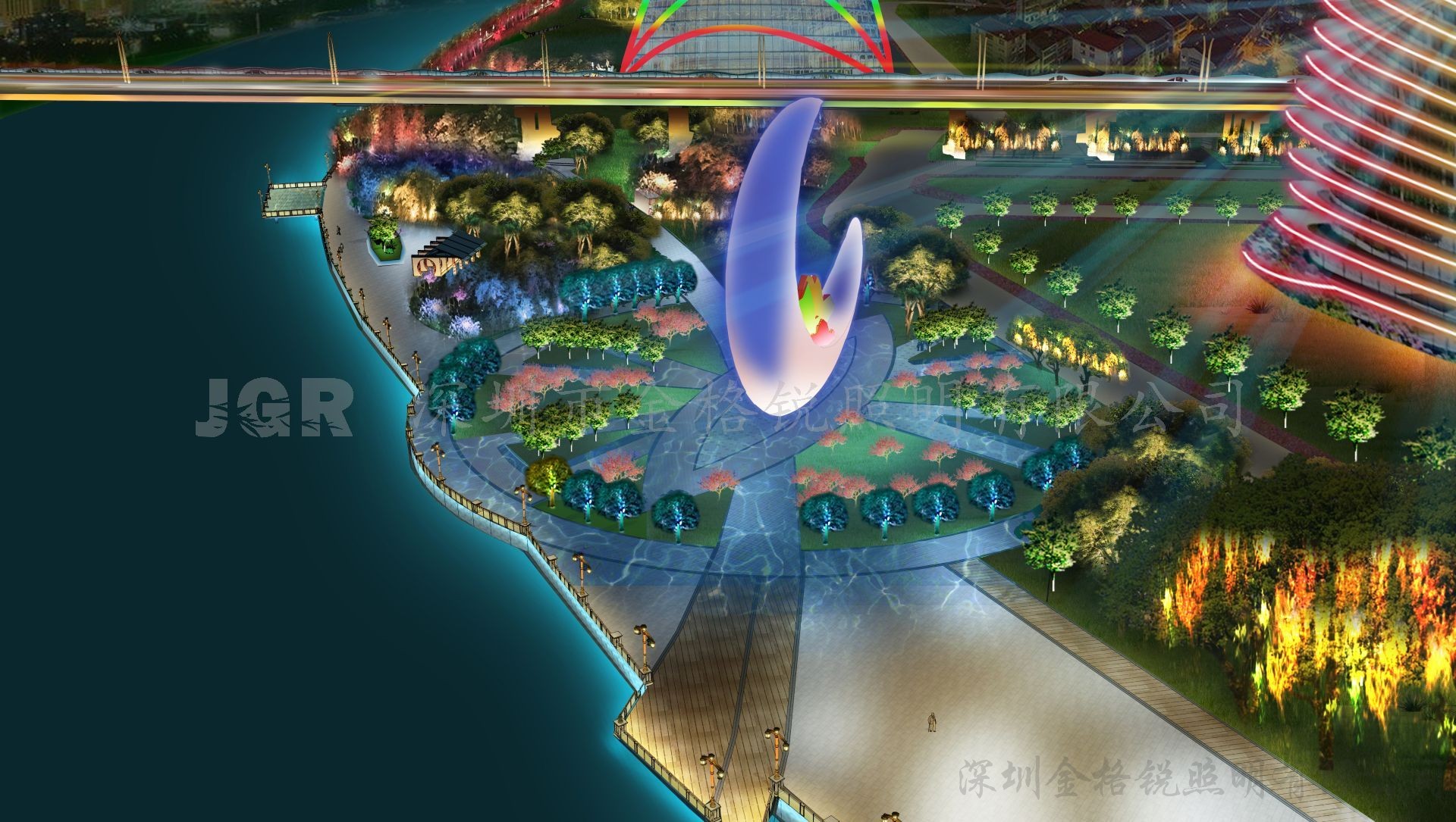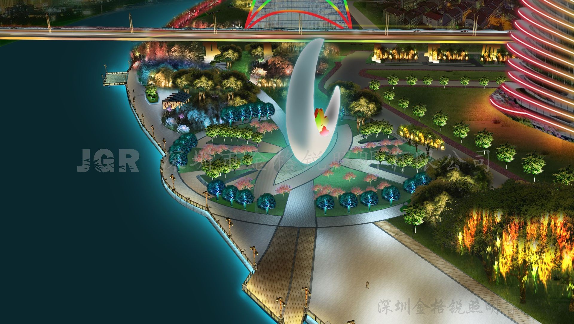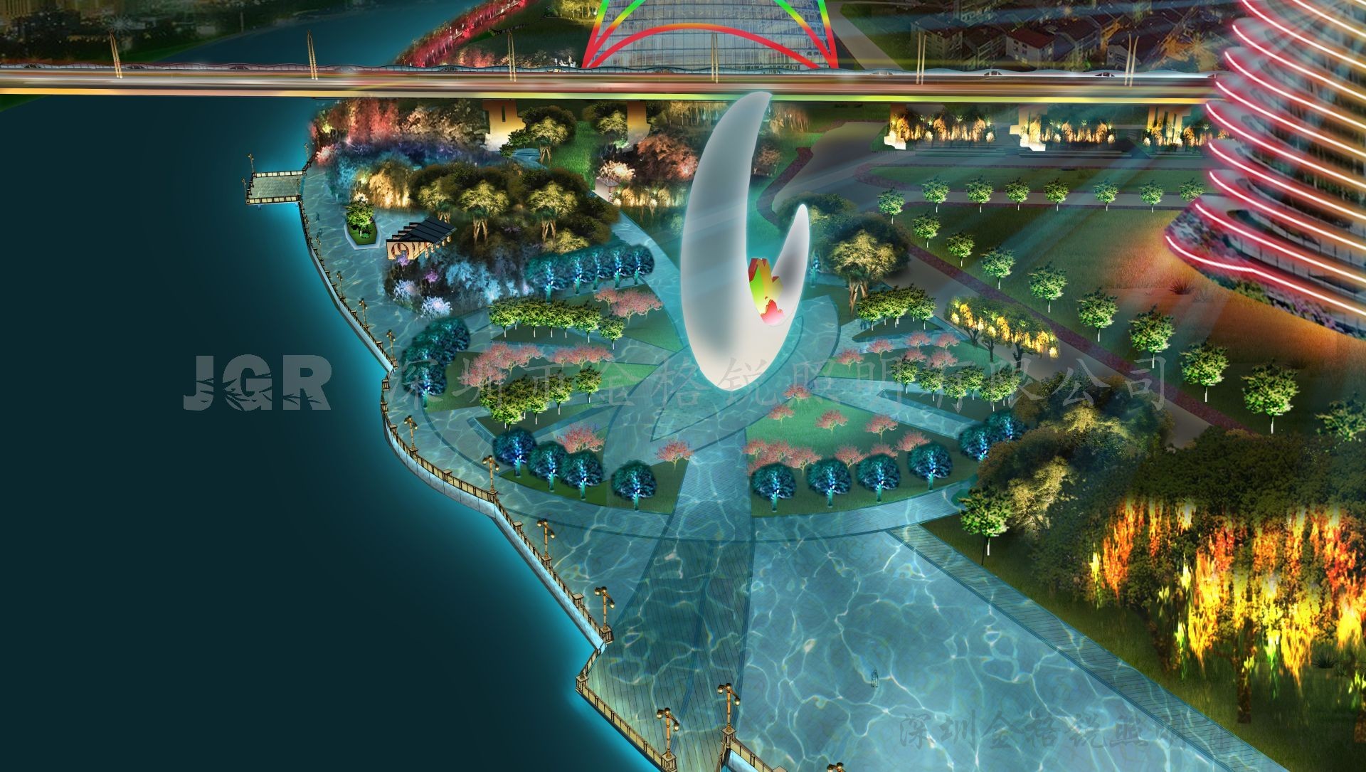 | 夜景簡介 | 同時(shí),將打造唯美的夜景景觀,通過對(duì)樓體燈光的多媒體顯示效果打造,用多彩的色彩變化與水自成倒影的相互效果,創(chuàng)造出七彩麻涌之水鄉(xiāng)特色。其中,半月型雕塑采用彩色光與周圍的環(huán)境光融為一體,用水紋效果使月亮浮潛于水上一般,并通過燈光色彩來改變月亮不同時(shí)段的色感。 |