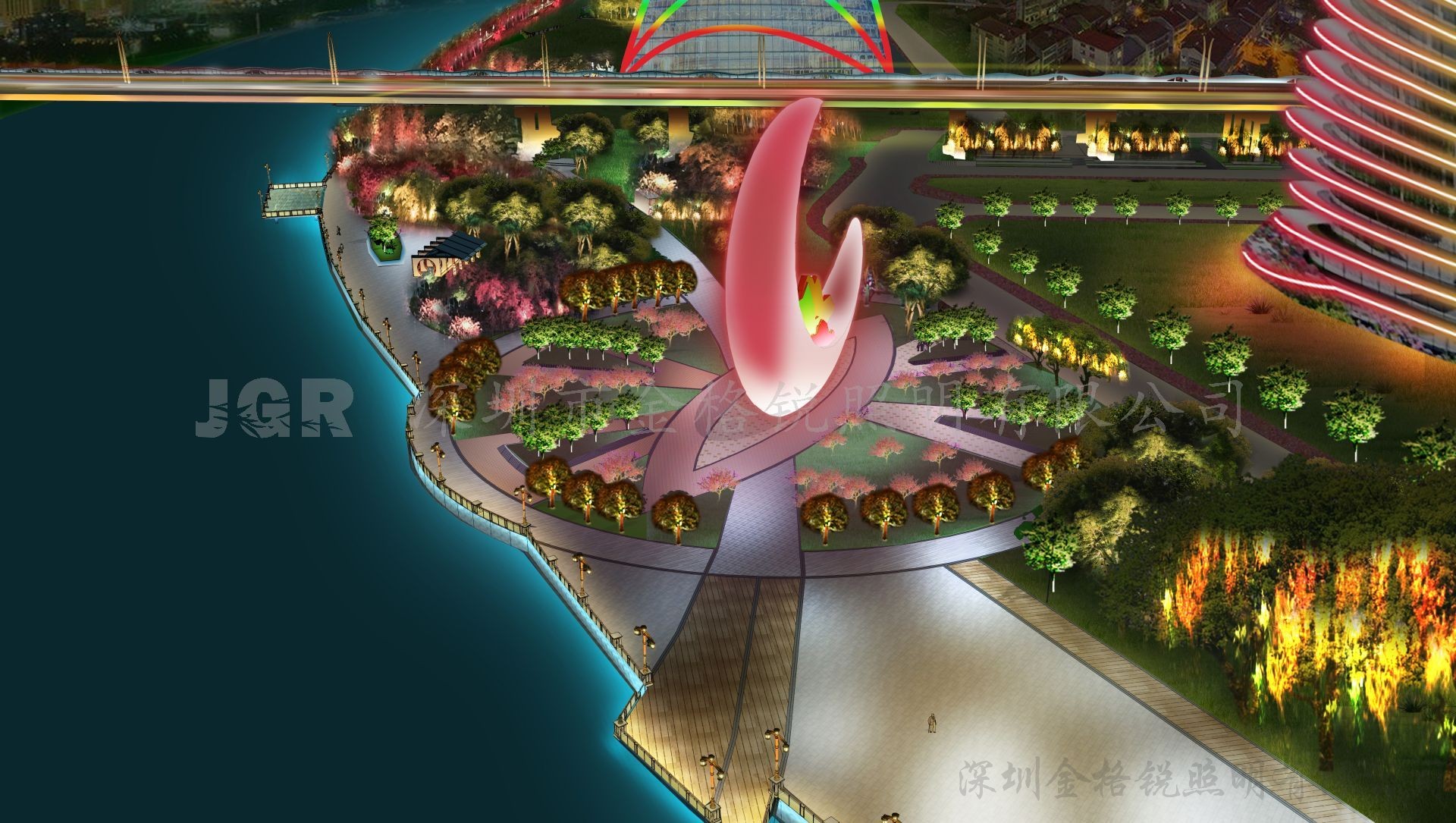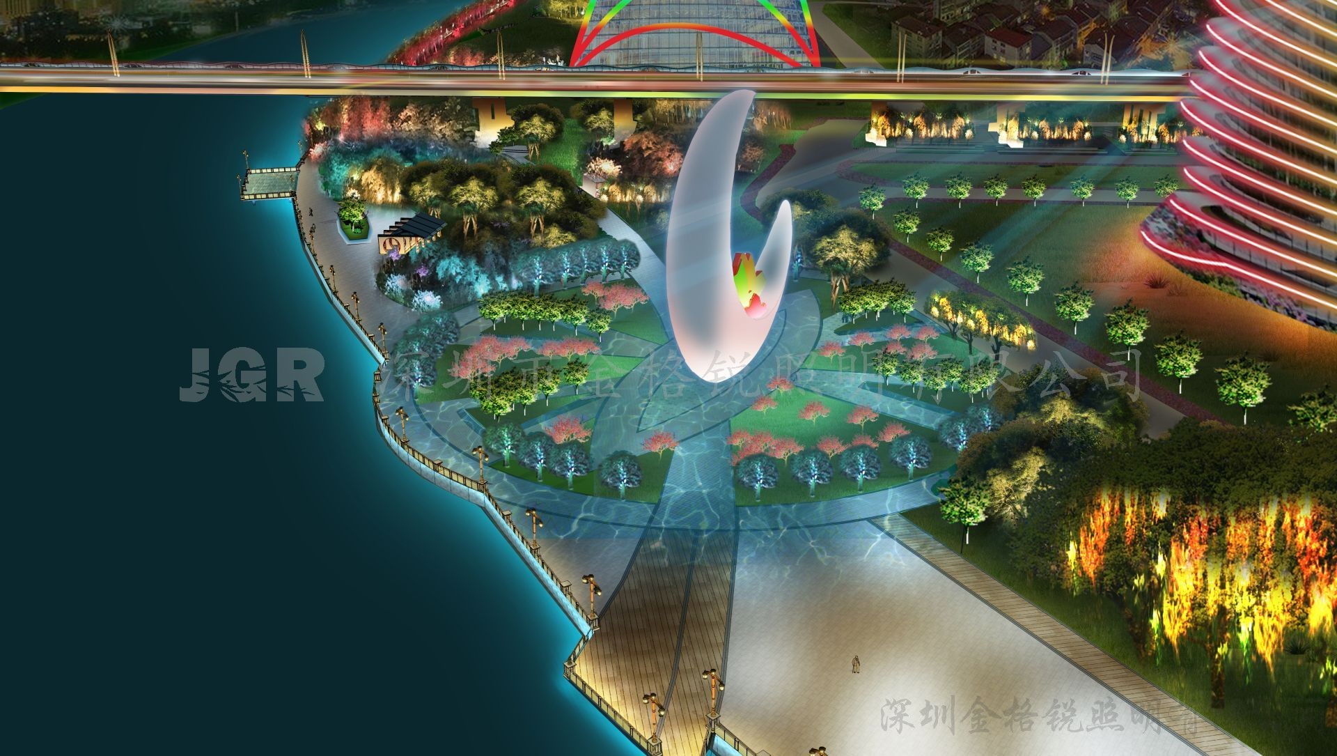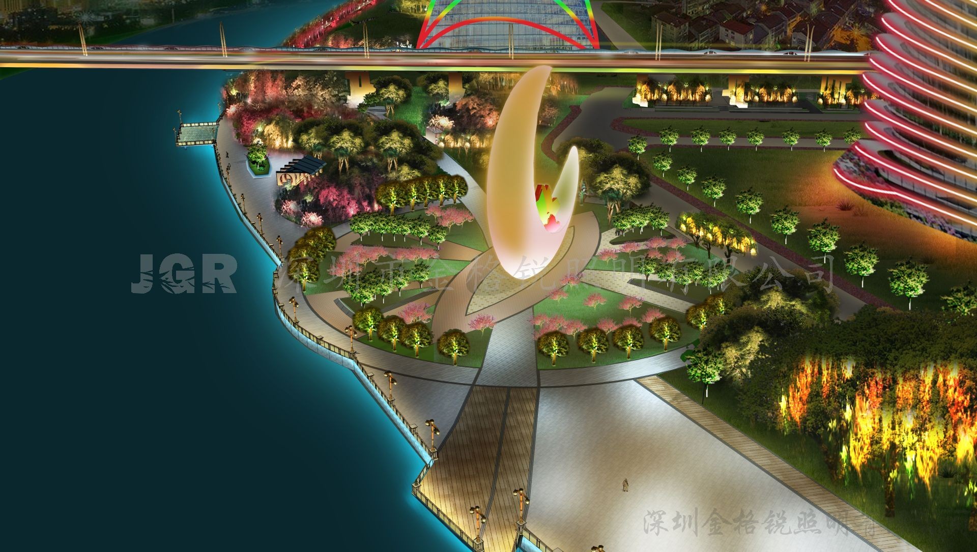 | 夜景簡介 | 同時(shí),將打造唯美的夜景景觀,通過對(duì)樓體燈光的多媒體顯示效果打造,用多彩的色彩變化與水自成倒影的相互效果,創(chuàng)造出七彩麻涌之水鄉(xiāng)特色。其中,半月型雕塑采用彩色光與周圍的環(huán)境光融為一體,用水紋效果使月亮浮潛于水上一般,并通過燈光色彩來改變月亮不同時(shí)段的色感。 |